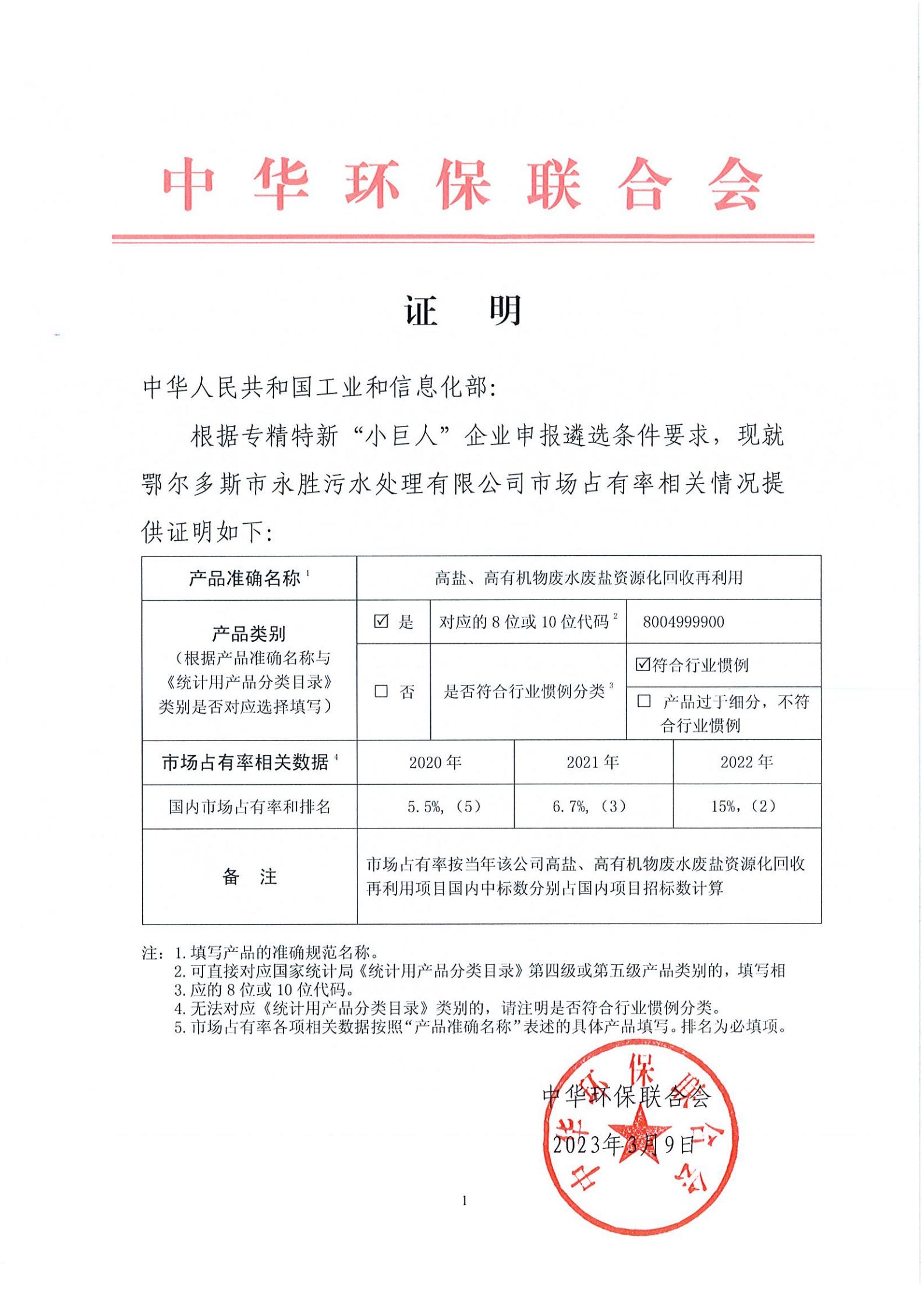 中华人民共和国工业和信息化部: 根据专精特新“小巨人”企业申报迷选条件要求,现就鄂尔多斯市永胜污水处理有限公司市场占有率相关情况提供证明如下: